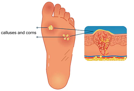 Corns and calluses are caused by pressure or rubbing of the skin on hands or feet, often due to wearing uncomfortable or ill-fitting shoes. Friction and pressure from repetitive movements can also contribute to their formation. While they are generally not harmful, they can occasionally lead to skin irritation, infection, or ulcers, particularly in individuals with diabetes or poor foot circulation.